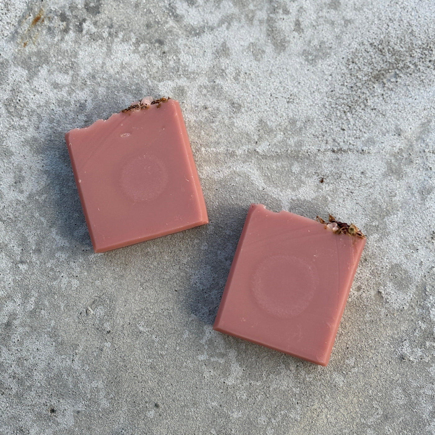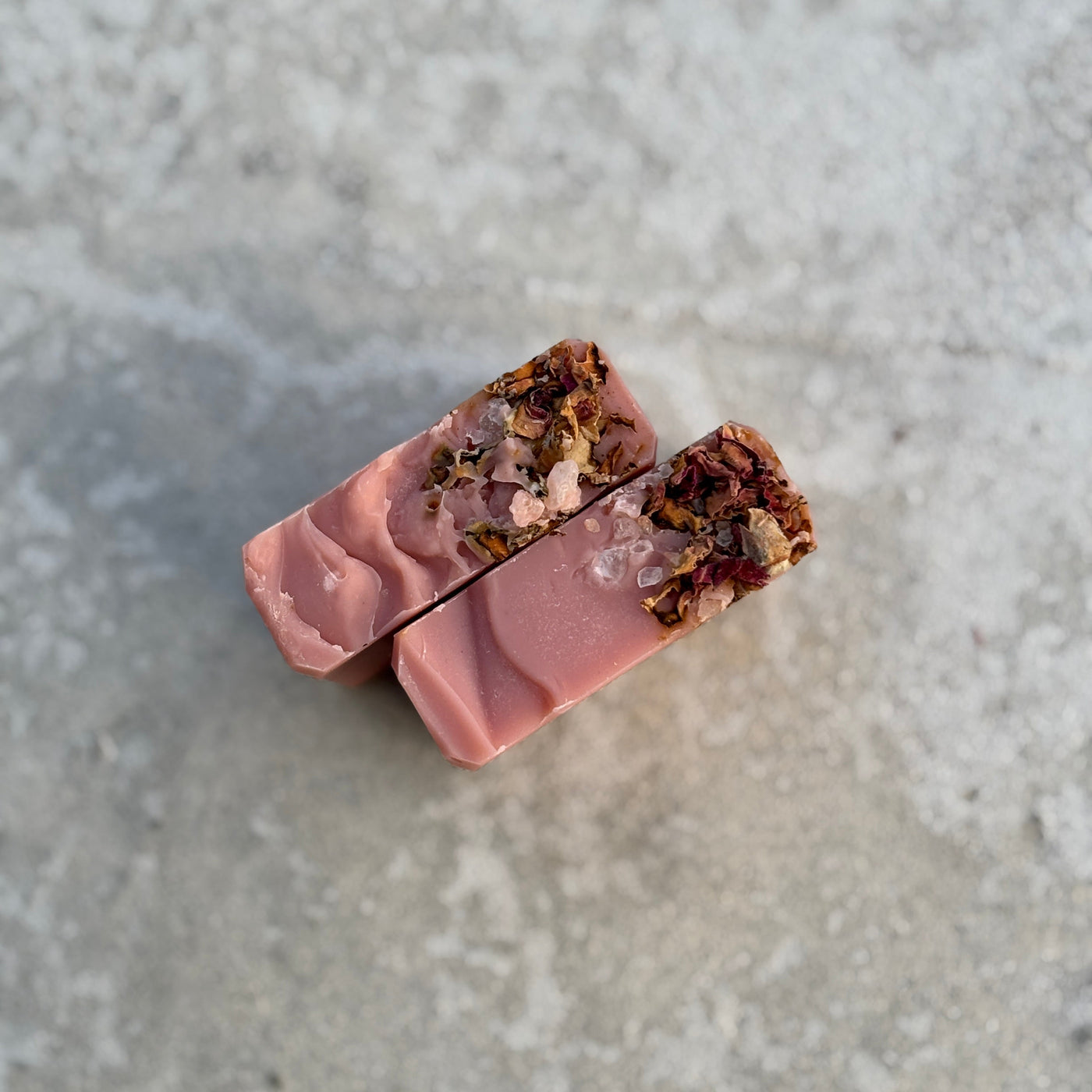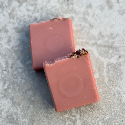 A gentle and nourishing soap with no added fragrance. Colored with white and pink kaolin clay and topped with dried rose petals.